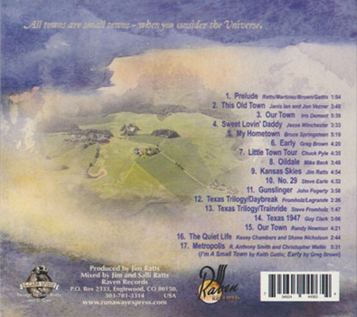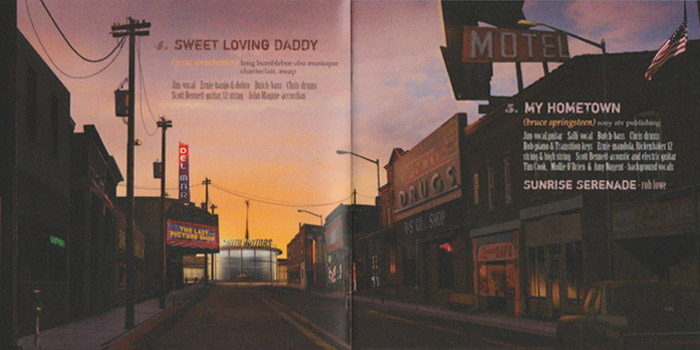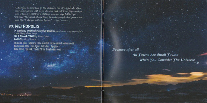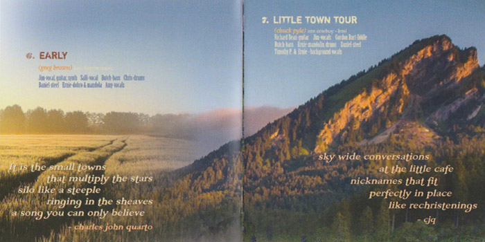 Small Towns "Sal and I would like to send a special thanks to family and friends who've supported the lengthy process (beginning in 1998!) of making this record ~ especially Graham Lewis and Jolly Demis (for his almost religious dedication to honesty as the project progressed); to our amazing band members (Butch, Chris, Gordon, Rob, Daniel and my constant studio companion Ernie) who gave me musical jewels to assemble and organize in an effort to call myself an arranger and producer; to the everlasting spirit of Scott Bennett; to Mason Williams, Bob Shane, John McEuen and David Amram for encouragement, support and inspiration; and to the eternal sirit of the American small town, a complex and curious construct existing al across this country, providing a potential place for serenity, personal growth and human unity." |
